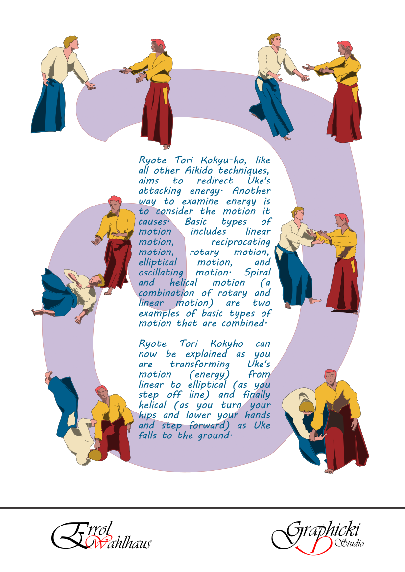 In this short book you are inrtoduced to Ryote Tori Kokyu-ho. In Ryote Tori Koky ho you step off Uke’s line of attack creating a circle that is tangential to Uke’s initial linear motion. As you draw Uke off his line of attack, Uke’s energy is changed from being focused, linear, to spiral and defused.